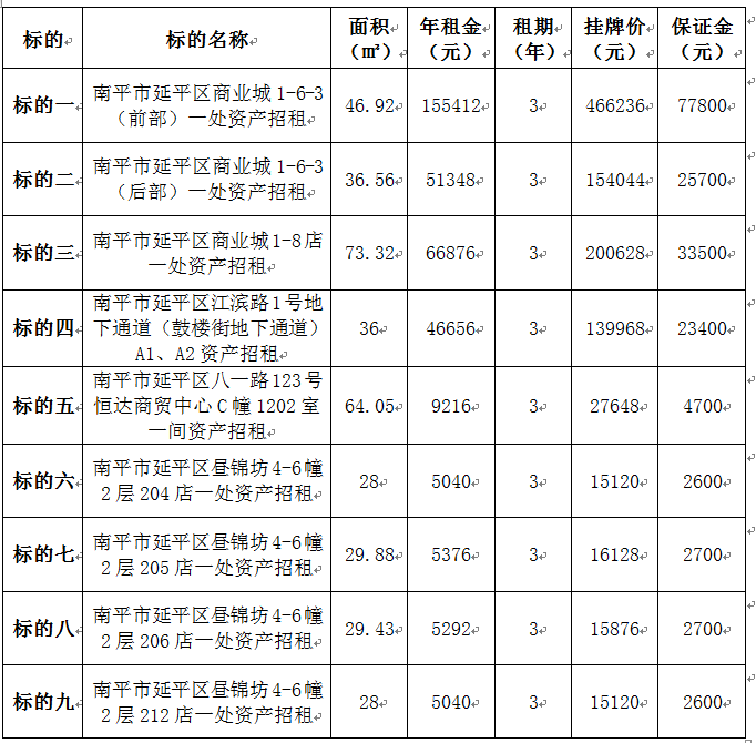 南平市延平區商業城1-6-3(前部)一處資產、江濱路1號地下通道、晝錦坊4-6幢等9處資產招租)